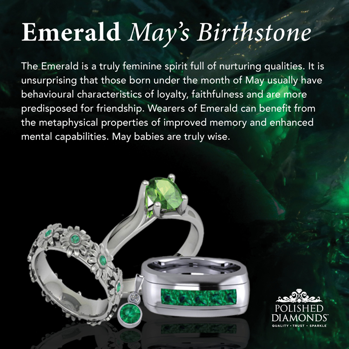The emerald is traditionally a feminine stone, and is associated with the planet Venus and romantic love. The green of emerald is said to be beneficial to the sight, and has been ascribed great healing power. It is also symbolic for the season of Spring and new life. The earliest reference to emeralds in Western literature comes from Aristotle; he was a great fan of the gemstone and wrote that owning an emerald increases the owner’s importance in presence and speech during business, gives victory in trials, helps settle litigation, and comforts and soothes eyesight. The Romans once considered light-coloured Emeralds to be unripe, and believed that an Emerald becomes a darker shade of green as it matures. Emerald is the traditional birthstone for May, and celebrates the 55th anniversary.
